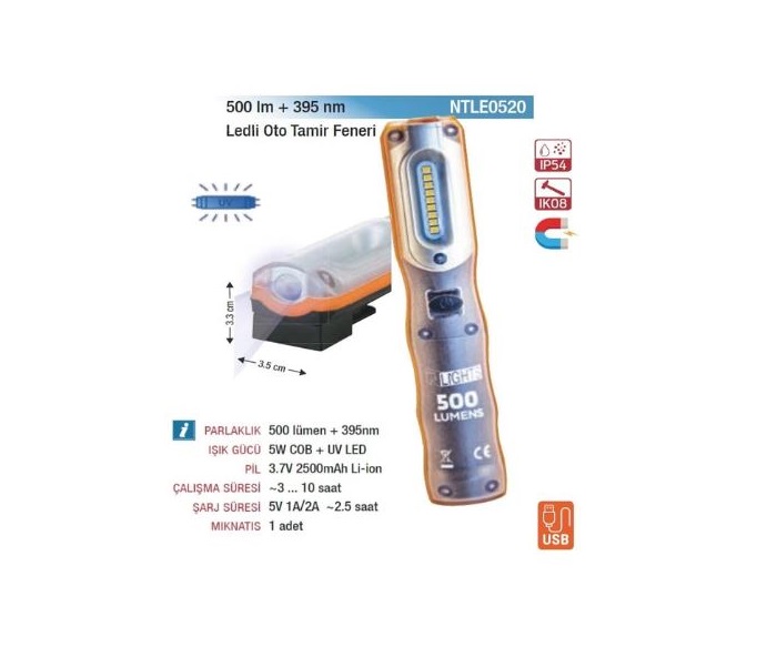 Nt Lights NTLE0520 500 Lümen + UV395 Nm Şarjlı Mıknatıslı Oto Tamir Feneri Led Lamba