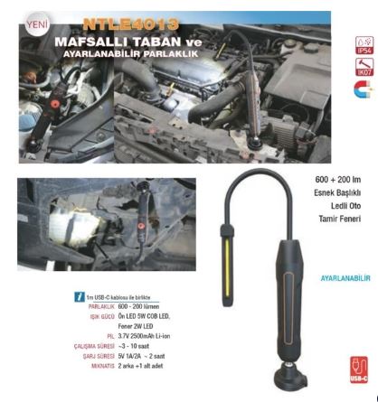 NT Lights NTLE4013 Şarjlı Mıknatıslı Oto Tamir Feneri Led Lamba 600+200 Lümen