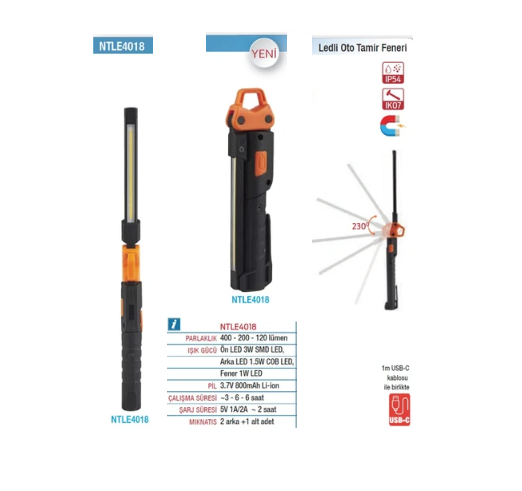 Nt Lights NTLE4018 Ledli Tamirci Feneri Çift Taraflı 400 + 200 Lümen